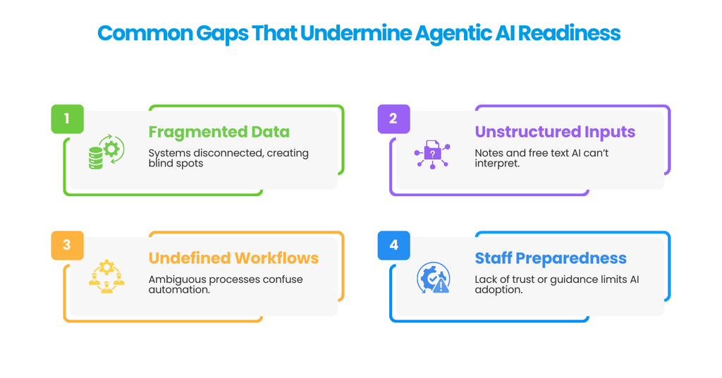 Even organizations with sophisticated tech stacks can face readiness challenges. These gaps prevent agentic AI from operating efficiently and may increase staff effort rather than reduce it.