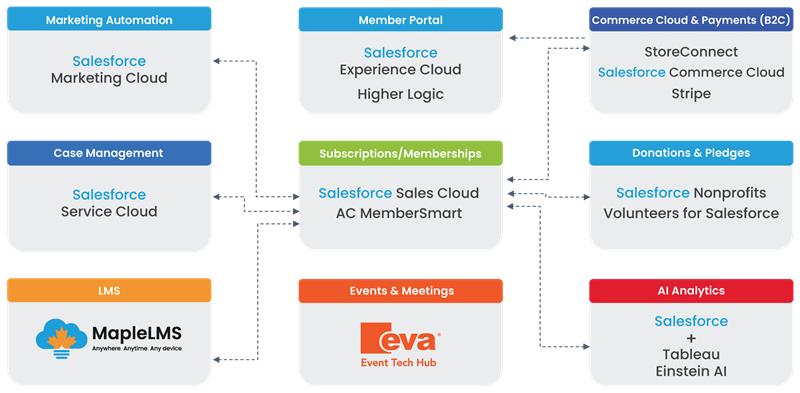 We integrate Salesforce Clouds with your existing tools to create a unified, intelligent AMS that manages everything, from renewals and donations to marketing automation and analytics.